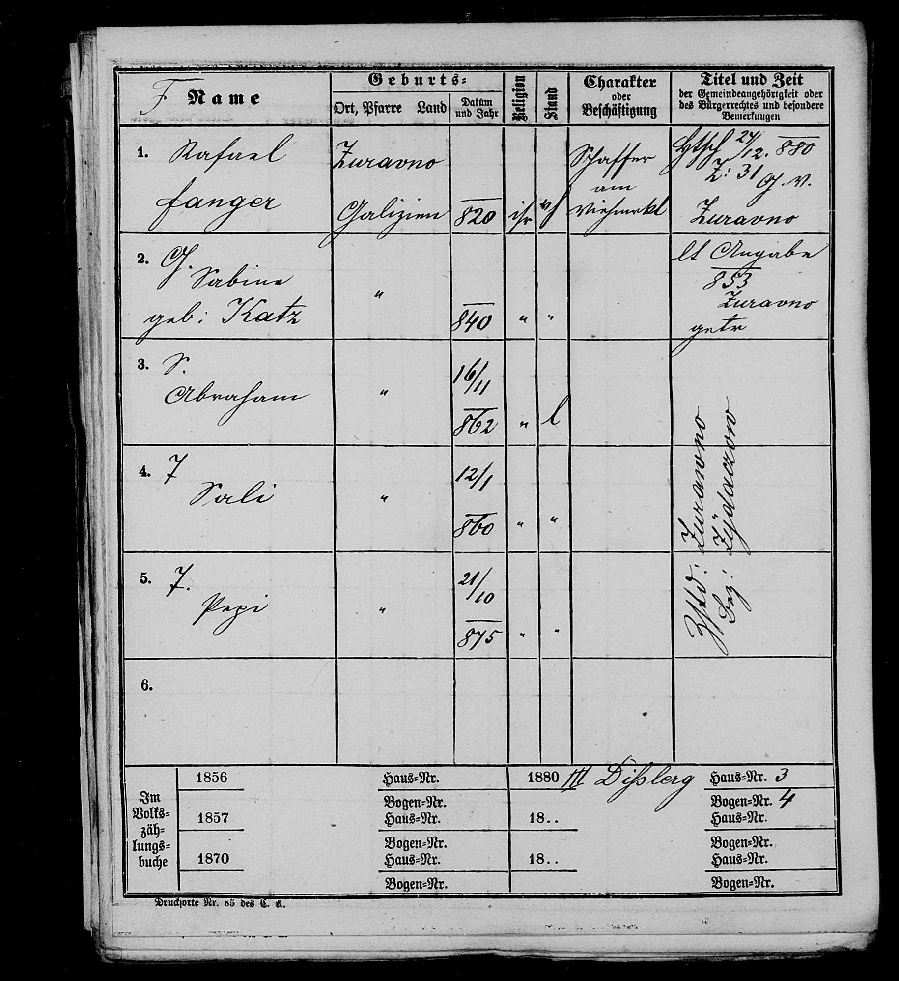 Max Günsbergs Urgroßeltern Rafael Fanger und Sime Fanger (geborene Katz) wurden in Zurawno geboren, heirateten hier 1853 und bekamen hier zwischen 1853 und 1862 sechs Kinder. Das Haus der Fangers lag nahe dem Zentrum von Zurawno, Nummer 148, wie auf dem Katasterplan von 1848 zu sehen: