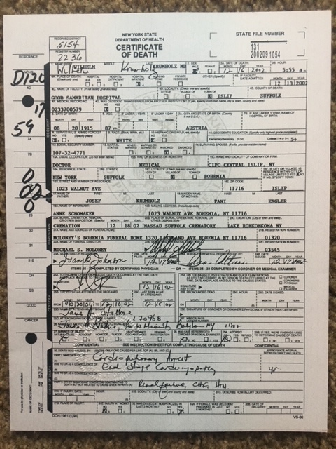 Wilhelm Krumholz hinterließ seine Lebenserinnerungen in den 1990er Jahren in einem Interview für das Visual History Archive der USC Shoah Foundation. Er starb in Bohemia, Suffolk, New York, am 16.12.2002.