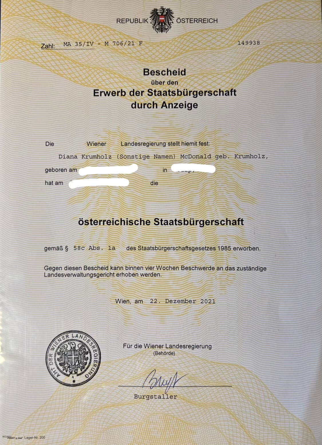 Seine Tochter Diana Krumholz-McDonald nahm 2021 ein entsprechendes Angebot des Staates Österreich an und ist seither als Nachkomme von Holocaust-Überlebenden auch österreichische Staatsbürgerin, ebenso wie ihre beiden Kinder Ross und Samantha. Das Wiederauffinden und die Kontaktaufnahme mit dieser Familie, deren Beziehung zur Familie Günsberg vor 1938 so eng gewesen war, gehört zu den absoluten und ungemein bereichernden Highlights meiner jahrelangen Recherchen.