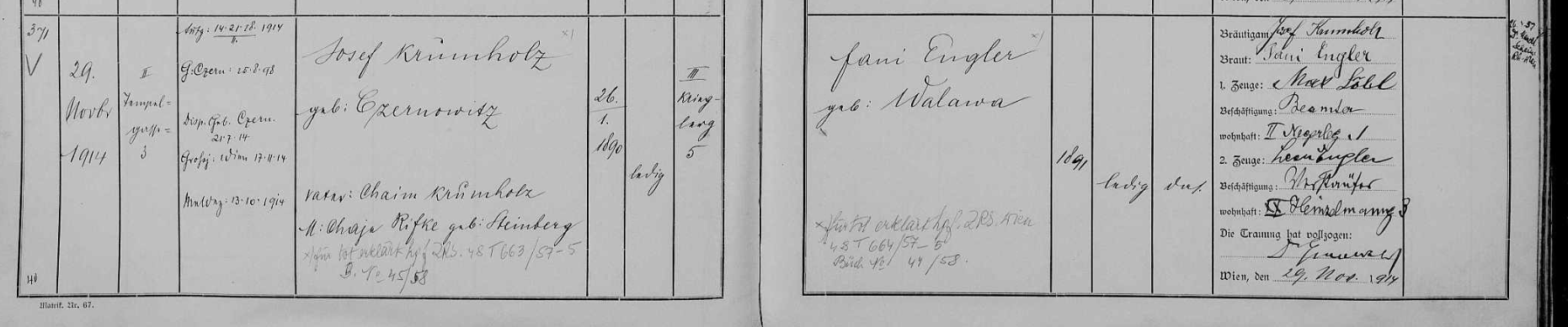 Fani lernte in Czernowitz Josef Krumholz (*26.01.1890 in Czernowitz), dessen Familie [hier] beschrieben ist, kennen und formvollendet gratulierte Josef seiner Angebeteten am 01.10.1910 zum neunzehnten Geburtstag:
