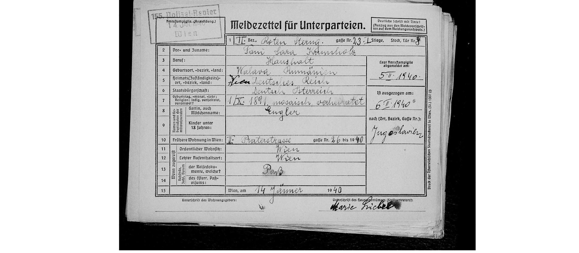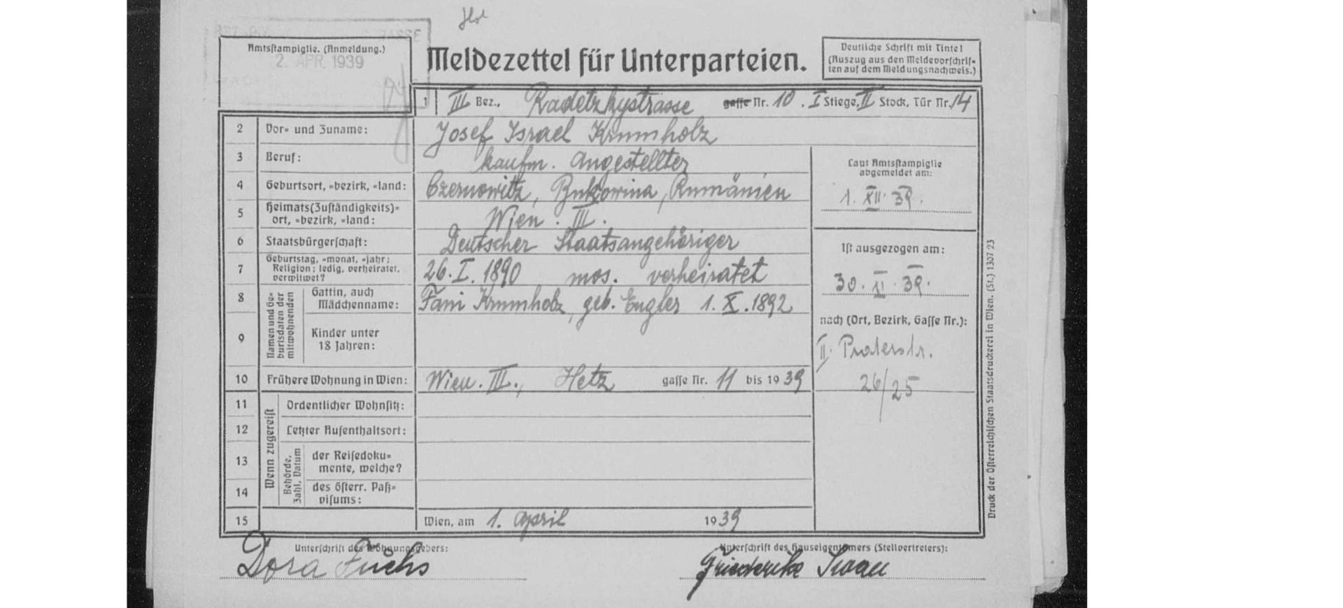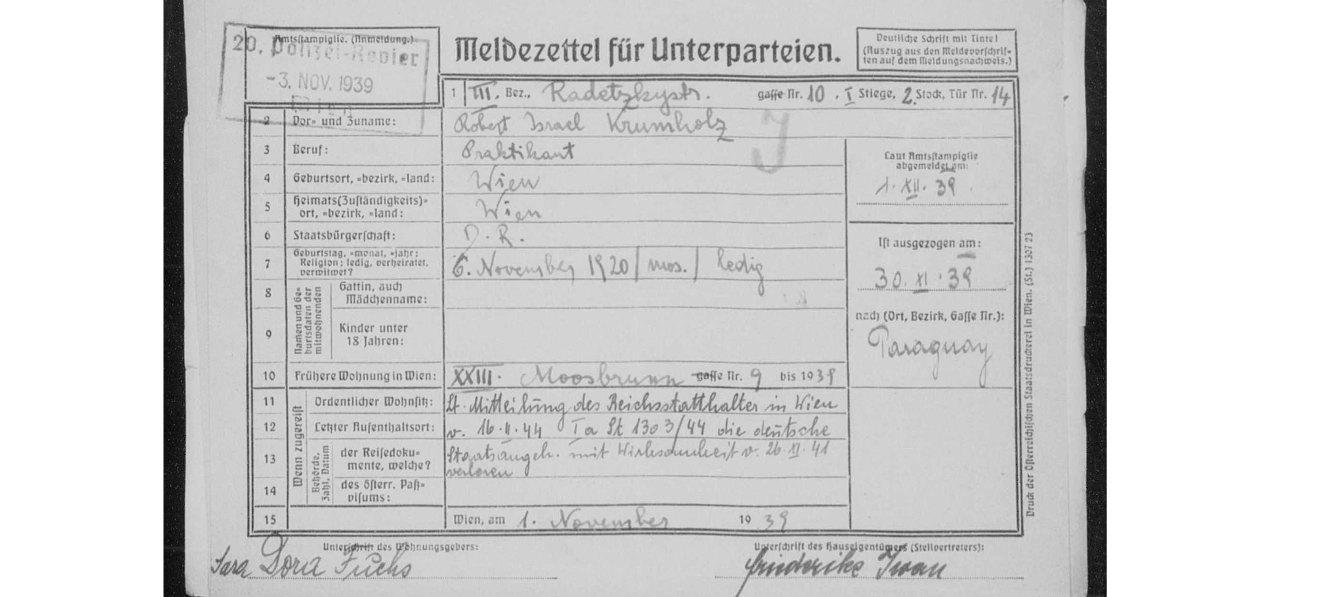 Die übrige Familie Krumholz, also Fani, Josef und Robert, verlor ihre Wohnung am 01.04.1939. Fanis Sohn Robert, der sich als Praktikant verdingte, kam in Moosbrunn 9 unter (Moosbrunn gehörte damals zum 23. Gemeindebezirk von Groß-Wien), Fani und Josef zogen vorerst zu Fanis Cousine Dora Fuchs wieder in die Wohnung der Englers, in die Radetzkystraße 10/14, wo bis 1938 ihre Mutter Klara gewohnt hatte. Josef musste zu dieser Zeit Zwangsarbeit beim Straßenbau in Korneuburg verrichten. Robert kam am 03.11.1939 in die Radetzkystraße 10 nach. Bereits am 30.11.1939 erfolgte jedoch die Beschlagnahme auch dieser Wohnung und sie mussten in eine Sammelwohnung in 1020 Wien, Praterstraße 26/25 umziehen und kurze Zeit später, am 14.01.1940 in eine andere Sammelwohnung in 1020 Wien, Rotensterngasse 23/8 (gemeinsam mit der Familie ihrer Schwester Dora Fuchs).