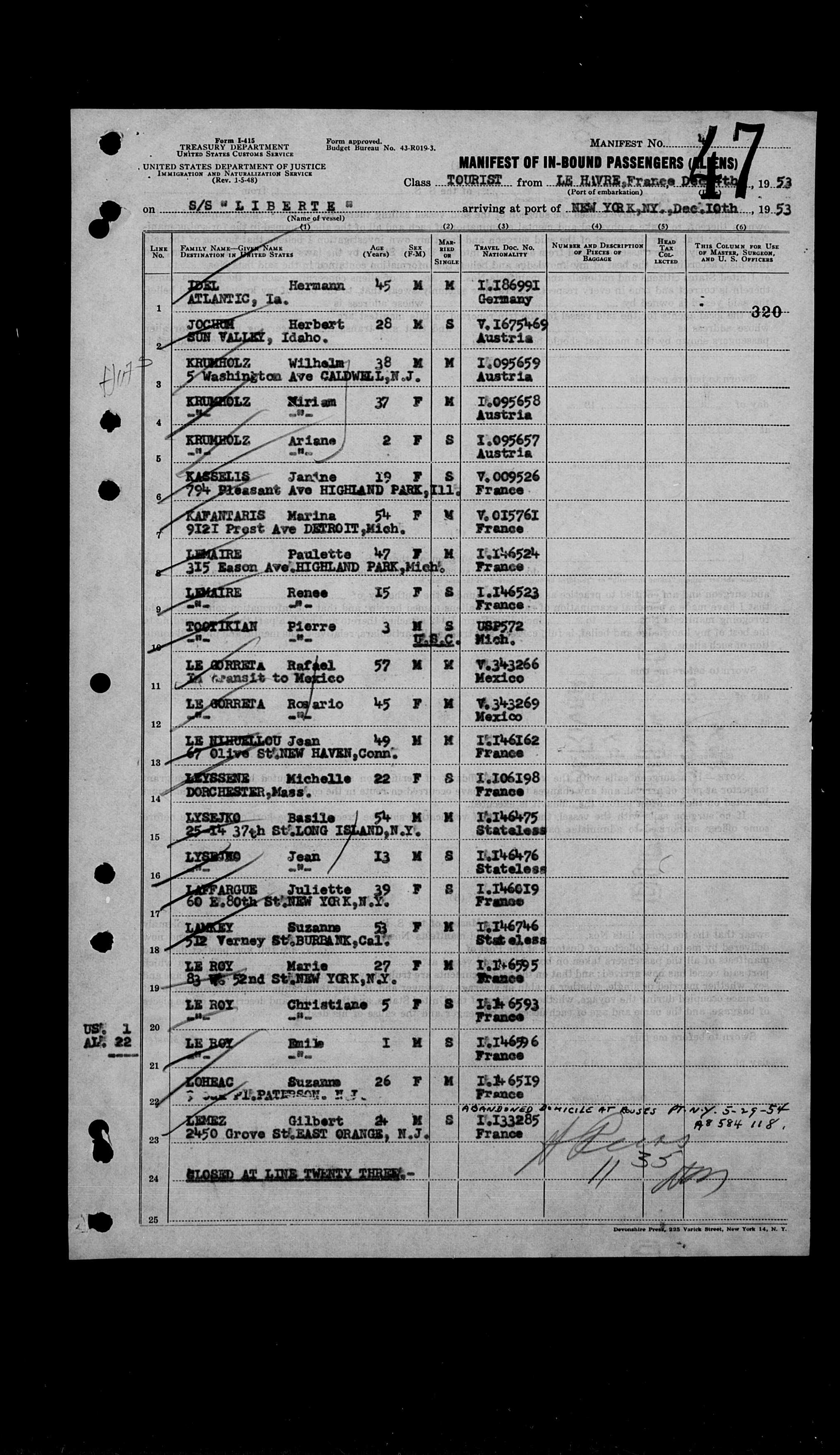 Am 11.05.1938 füllte Josef Krumholz einen Auswanderungsfragebogen aus und gab dort als ausländische Verwandte eine Schwester namens Regina Teffner in Argentinien an. Das müsste demnach seine am 01.09.1884 geborene Schwester Ruchel gewesen sein. Weiters gab er einen Cousin W.H. Wannowsky in Pasadena, CA, an, der laut Census von 1930 mit seiner Familie in Pasadena lebte. Schließlich gab Josef noch eine Cousine namens Rekie Bender aus Niagara Falls, NY, an. Dieser Name findet sich bei der Sozialversicherung in Form einer Beatrice Bender, deren Eltern Regina Teffner (siehe oberhalb) und Benjamin Bender hießen.