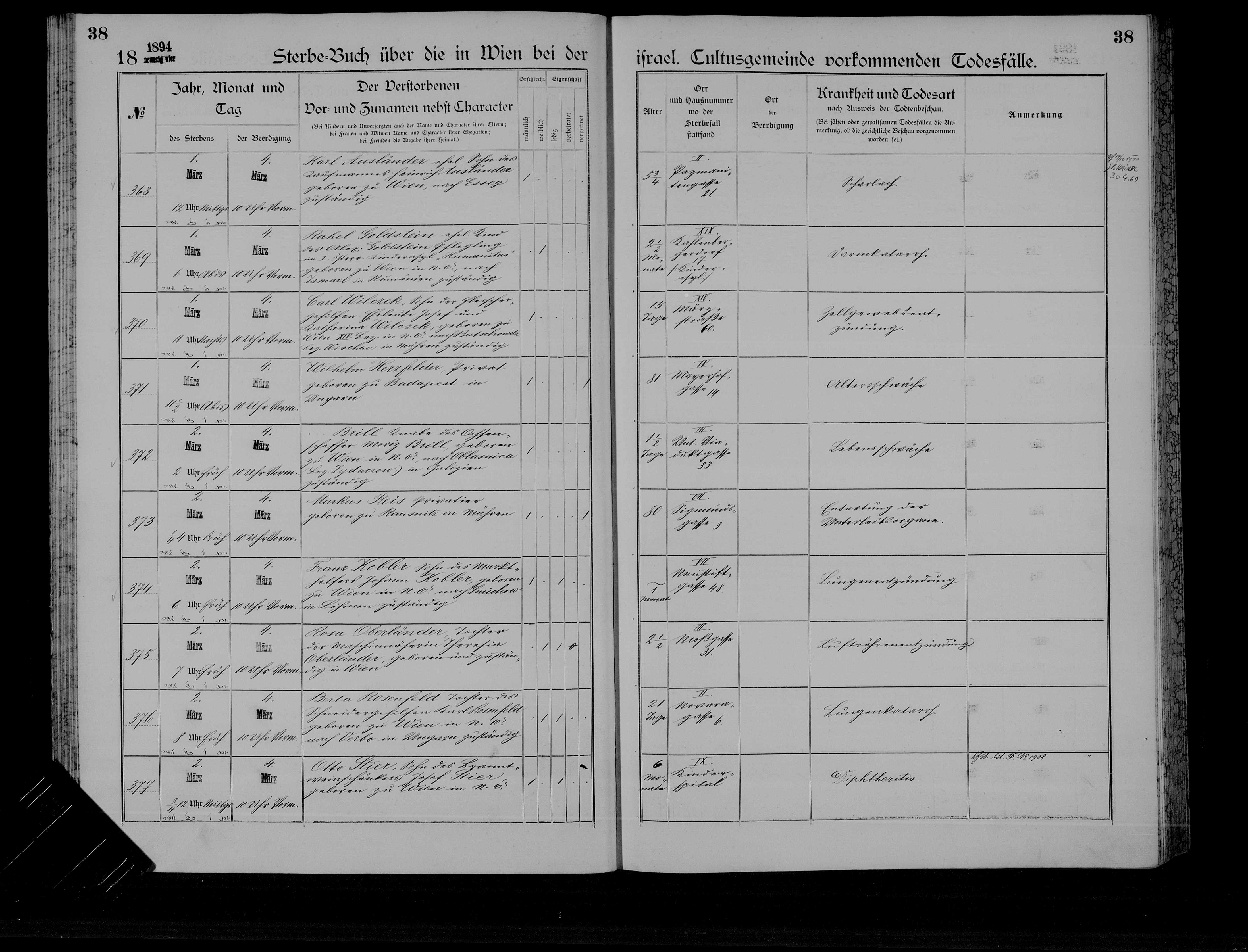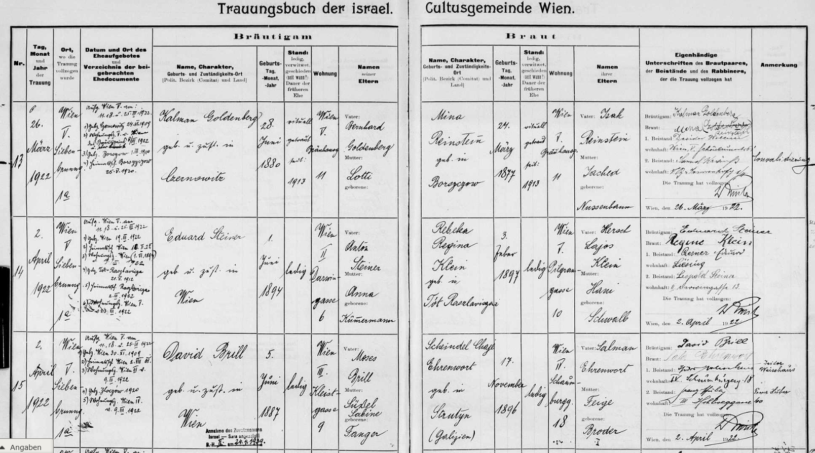 - Marietta/Marie Brill wurde am 23.12.1888 in Wien geboren. Ihr war allerdings kein langes Leben beschieden, sie starb noch als Säugling am 01.03.1889 an einer Lungenentzündung. Dennoch sollte sie viele Jahre später posthum noch eine Rolle spielen, wurde sie doch bei der Testamentseröffnung Ihres Onkels Abraham Fanger im Jahr 1914 als Erbberechtigte angeführt. Sogar ihre Unterschrift findet sich auf der Todfallsaufnahme ihres Onkels. Warum jemand anderes unter falschem Namen firmierte kann nur spekuliert werden. Möglicherweise sollte ein größeres Erbteil erschlichen werden. Maries Mutter Sabine Brill war bei früheren Gelegenheiten ja ähnlich "kreativ".