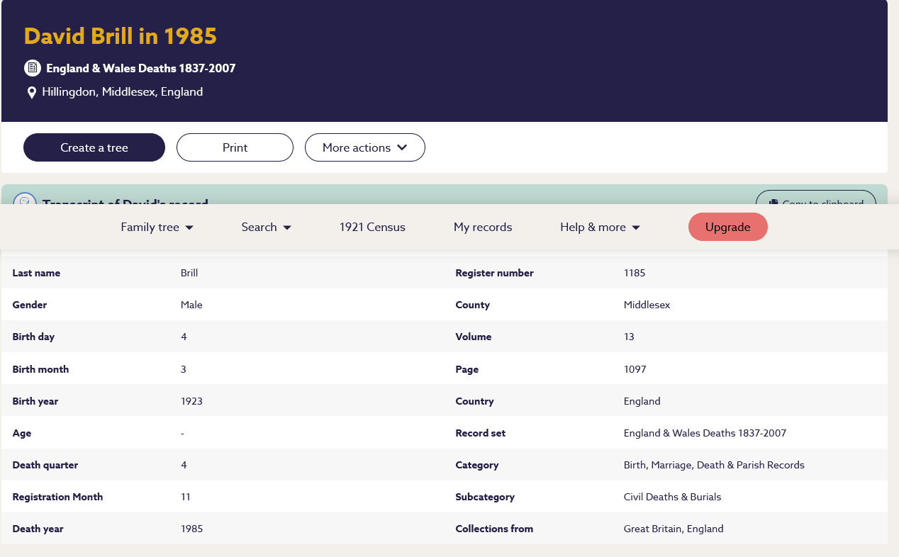 - Otto Brill wurde am 04.03.1923 in Wien als Sohn von David und Scheindel Brill geboren. Nach dem Tod seiner Mutter (vor 1938) bewohnte er gemeinsam mit seinem Vater David ein Untermietzimmer in 1090 Wien, Müllnergasse 6/33. Die völlige Mittellosigkeit seines Vaters sollte sich als Segen erweisen. David meldete seinen Sohn Otto zur Jugendalijah an, dieser wurde als förderungswürdig anerkannt und kam in den Genuss eines der sehr seltenen "Palästina-Zertifikate", die eine Ausreise nach Palästina ermöglichten. Otto Brill erhielt auf diese Weise am 01.08.1939 in Wien einen Pass und kam, zwar mit Verzögerung, deren Ursache nicht zu eruieren war, aber doch tatsächlich am 31.01.1940 im damals britischen Mandatsgebiet Palästina an, der Staat Israel sollte ja erst einige Jahre später, 1948, entstehen. In Palästina meldete er sich zum Militärdienst in der britischen Armee und trat diesen am 05.06.1941 an. Am 19.04.1942 suchte er um die palästinensische Staatsbürgerschaft an und erhielt diese am 28.10.1942. Am 21.11.1946 nahm er schließlich, auch im Gedenken an seinen ermordeten Vater, statt Otto den neuen Namen "Moshe Ben David" an. Er war mit Lily (*22.01.1924) verheiratet, die Ehe blieb jedoch kinderlos. Otto/David starb in England am 21.11.1985, er wurde in Hillingdon, Middlesex, westlich von London, begraben. Seine Frau Lily starb am 28.08.1996 ebenfalls in England und ist im selben Grab beigesetzt.