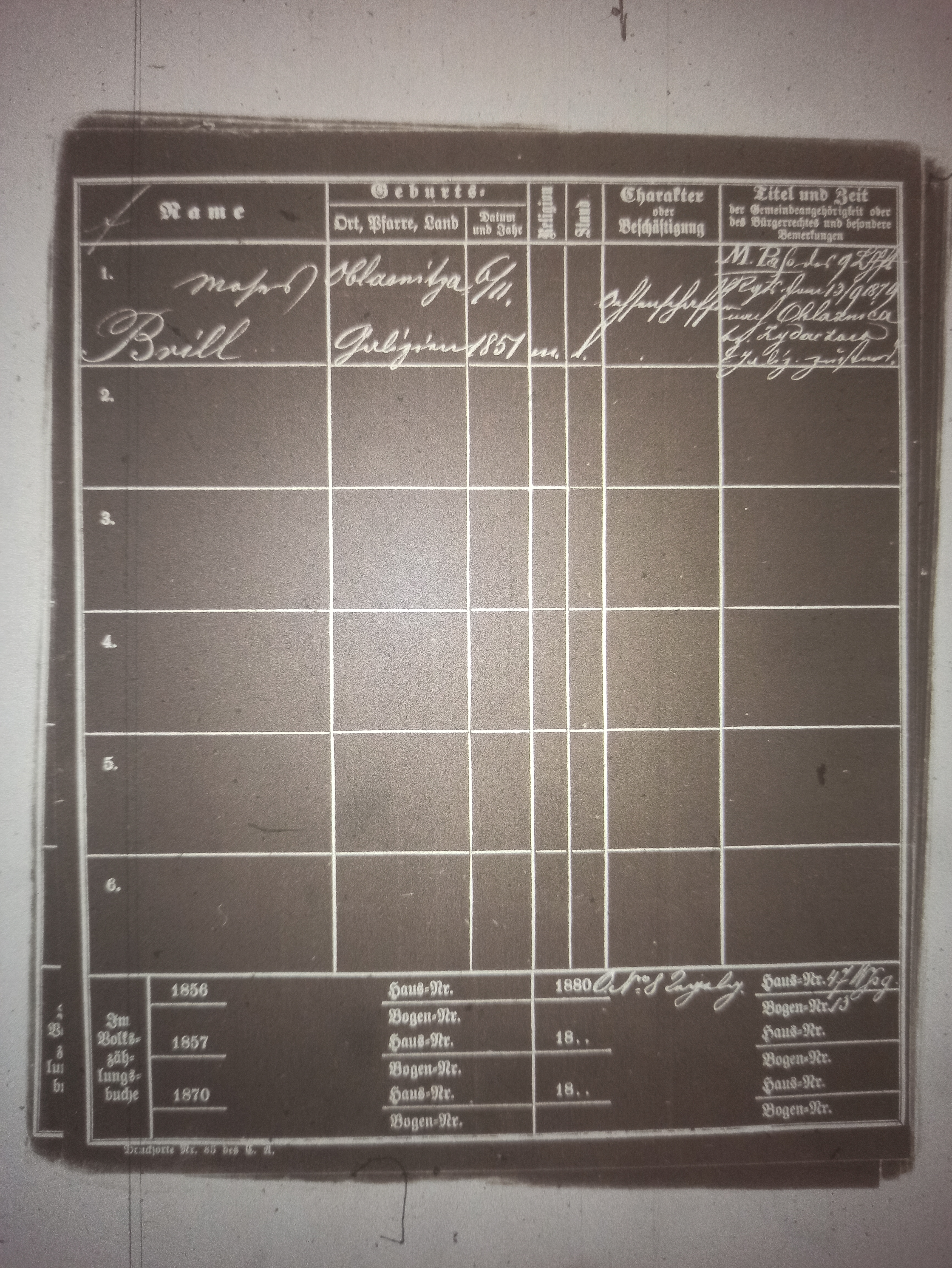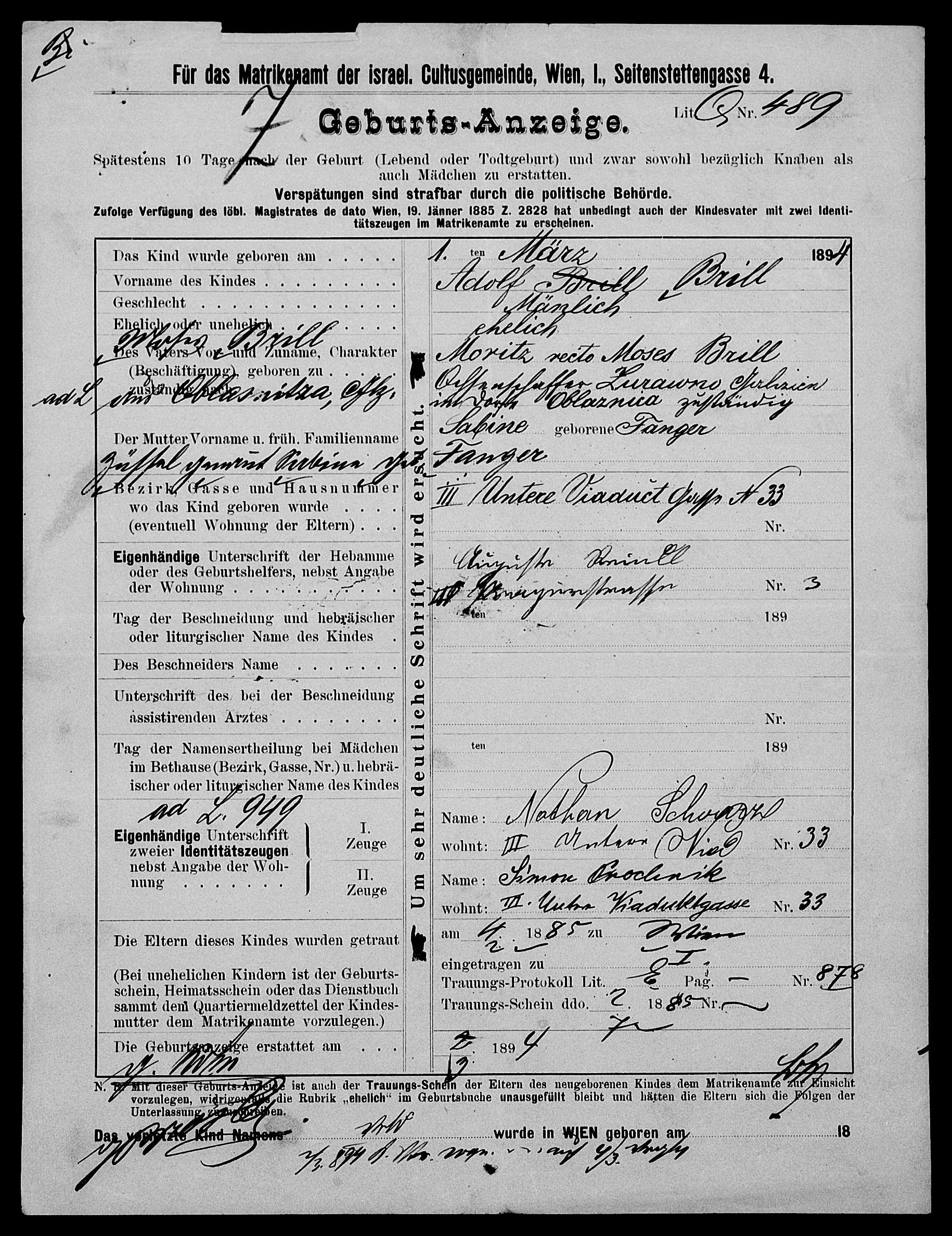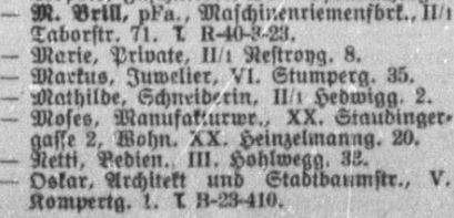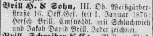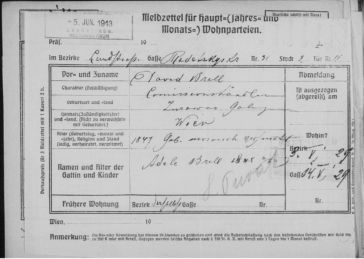 Am 03.09.1879 war Moses Brill nach Wien gekommen und zumindest bis 1894 am Viehmarkt als Ochsenschaffer tätig. [Der Begriff des Ochsenschaffers ist in keinem zeitgenössischen Wörterbuch und in keinerlei Literatur zu finden. Sehr wohl jedoch der Begriff des Viehschaffners. Laut Meyers Großem Konversationslexikon: „Viehschaffner (Viehpraxer), Wärter, Aufseher, auch Kaufvermittler für Vieh.“]