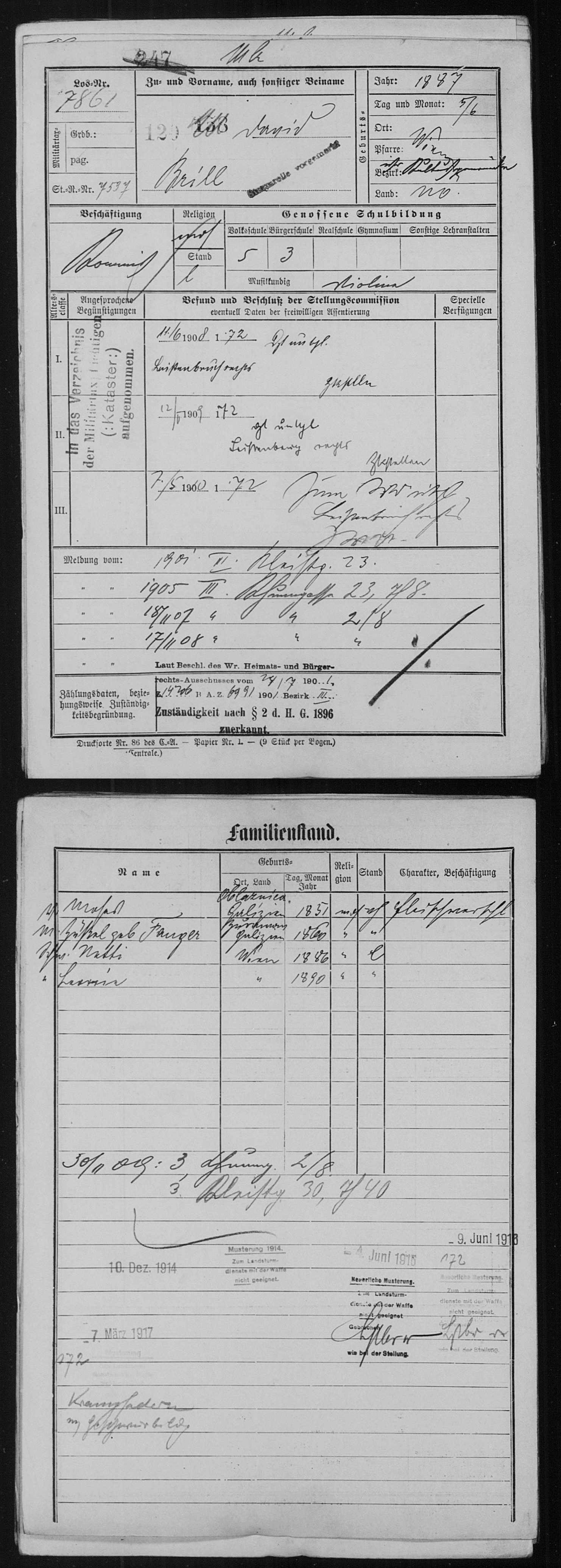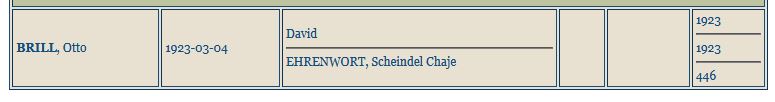 - David Brill wurde am 05.06.1887 in Wien geboren. Er genoss hier acht Jahre Schulbildung (5 Jahre Volksschule, 3 Jahre Bürgerschule) und erlernte das Violinspiel. Laut einer Annonce vom 31.03.1911 (Neues Wiener Tagblatt, Seite 38) suchte er eine Anstellung als Verkäufer uns Arrangeur in der Galanterie-, Lederwaren- und Reiserequisitenbranche. Seit Beendigung des 20. Lebensjahres musste er wiederholt zur Musterung beim Militär, zuletzt in den Kriegsjahren von 1914 bis 1917. Er wurde zu seinem Glück jedoch jedes Mal als untauglich für den Dienst mit der Waffe befunden. Er wohnte frühestens ab 1911 bis 1915 in 1090 Wien, Pramergasse 29. Er heiratete am 02.04.1922 in Wien Scheindel Ehrenwort (*17.11.1896 in Strutyn) und bekam mit ihr am 04.03.1923 einen Sohn namens Otto Brill.