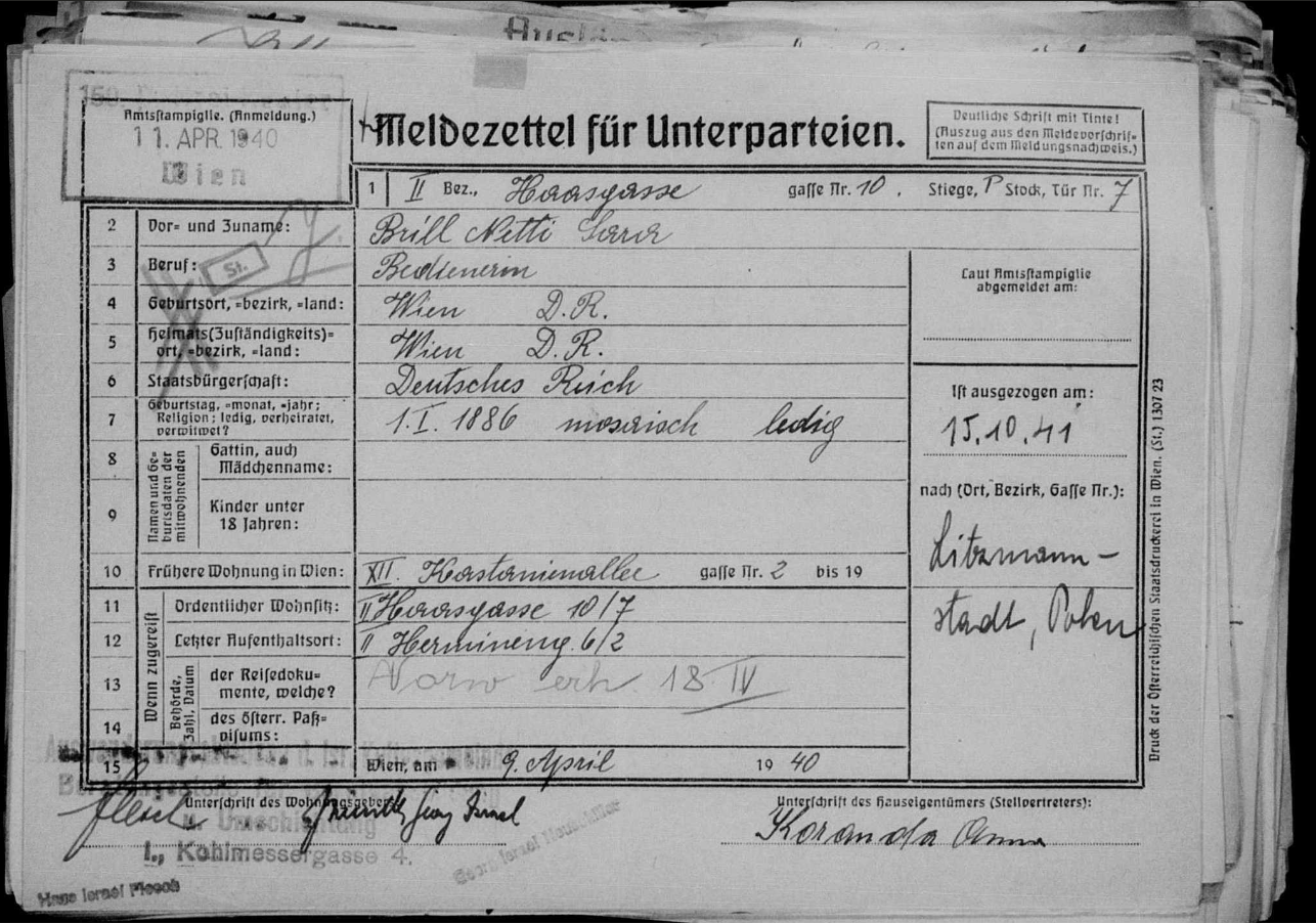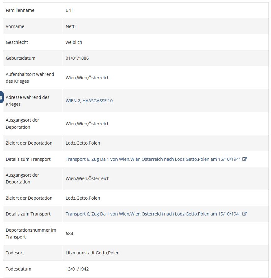 Netti/Jeanette Brill wurde am 01.01.1886 in Wien geboren. Ab 1903 wohnte sie in 1030 Wien, Untere Viaductgasse 3 und verdingte sich einige Jahre als Wäscheerzeugerin mit einem eigenen Geschäft im dritten Bezirk, Kolonitzplatz 7. Nach dem Tod ihrer Mutter Sabine (1911) findet sie sich im Wiener Adressbuch als Kaffeesiederin in 1020, Kaiser Josefstraße 36. An dieser Adresse (heute Heinestraße 36) befindet sich auch heute (2023) noch ein Kaffeehaus. Einige Jahre später (1918 bis etwa 1922) betrieb sie eine Spirituosenausschank im ersten Bezirk, Tiefer Graben 10. Um 1930 wohnte sie in Wien im dritten Bezirk, Hohlweggasse 33, und arbeitete als Bedienerin. Zuletzt wohnte sie in einer Sammelwohnung im zweiten Bezirk, Haasgasse 10 und wurde am 15.10.1941 ins Ghetto Lodz/Litzmannstadt deportiert. Am 13.01.1942 starb sie dort, als Todesursache ist Entkräftung angegeben. Vermögen wurde noch nachträglich laut Einziehungserkenntnis vom 19.07.1943 von Staats wegen geraubt.