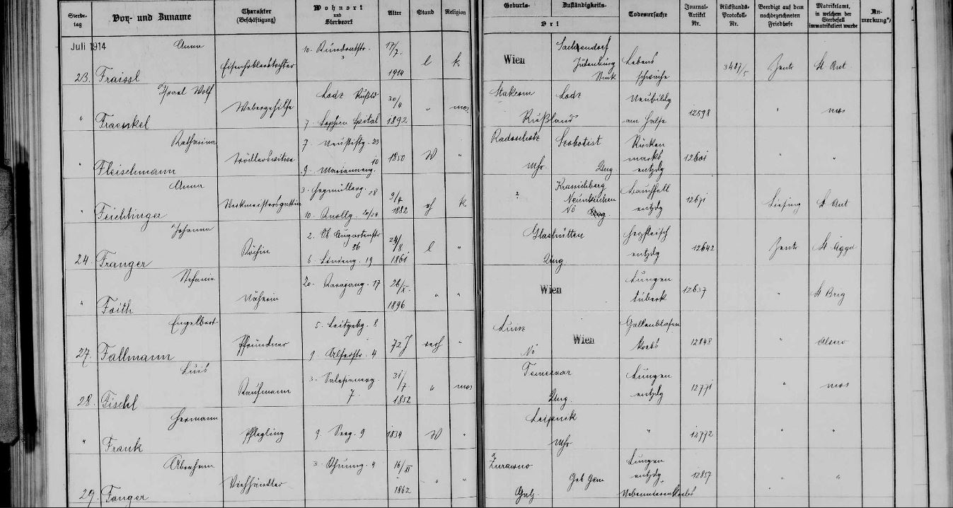 Abraham Fanger starb am 29.07.1914 in Wien und wurde am 31.07.1914 am neuen jüdischen Friedhof begraben. Da er keine direkten Nachkommen hatte und auch seine Eltern längst verstorben waren, waren in erster Linie seine Geschwister Sabine Brill, Chaje Gräber, Paula Schenke sowie die noch in Galizien ansässige Rosa/Reisie Günsberg erbberechtigt.