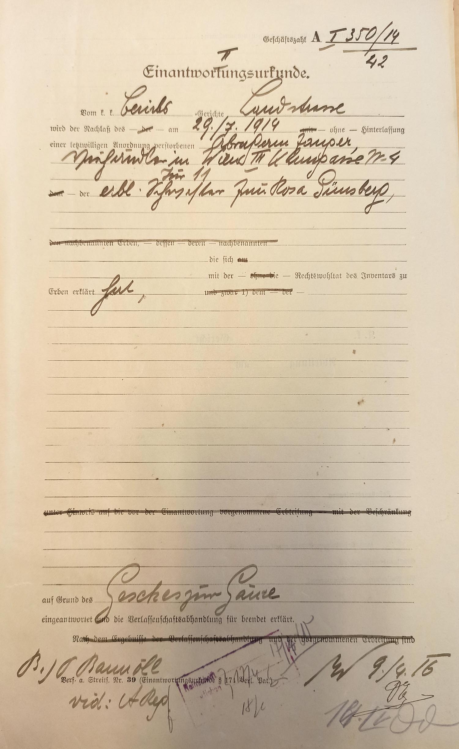 Schlussendlich wurde sein Nachlass, allerdings erst 1916, zur Gänze an Rosa/Reisie Günsberg, die Großmutter von Max Günsberg, eingeantwortet. Zu diesem Nachlass zählten neben der Wohnungseinrichtung aus der Khunngasse 4/11 drei Sparbücher mit Einlagen von in Summe einigen Tausend Kronen.