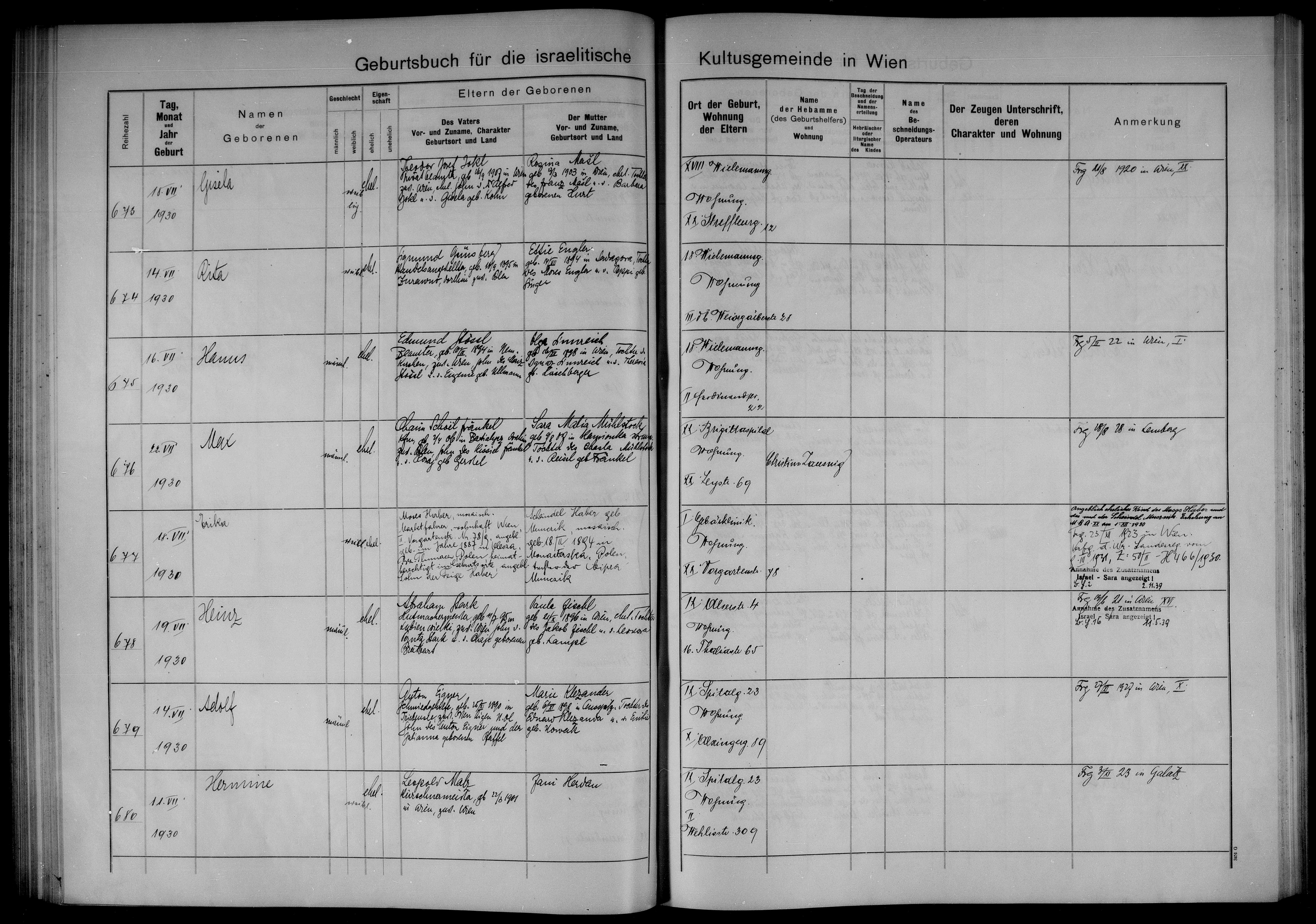 Rita Günsberg kam am 14.07.1930, genau am 40.Geburtstag ihrer Mutter Etti Günsberg, in Wien im 18. Bezirk, Wielemansgasse 28, in der Entbindungsanstalt der Angestellten der Wiener Kaufmannschaft als Tochter von Setyk und Etti Günsberg zur Welt. Es dürfte kein Zufall sein, dass die Entbindung von Rita, wie auch schon die ihrer Schwester Herta fünf Jahre zuvor, nicht als Hausgeburt mit einer Hebamme wie beim erstgeborenen Bruder Max Günsberg, sondern unter ärztlicher Aufsicht in Entbindungsanstalten erfolgte. Etti war für damalige Verhältnisse mit 35 bzw. 40 Jahren eine sehr späte Mutter.