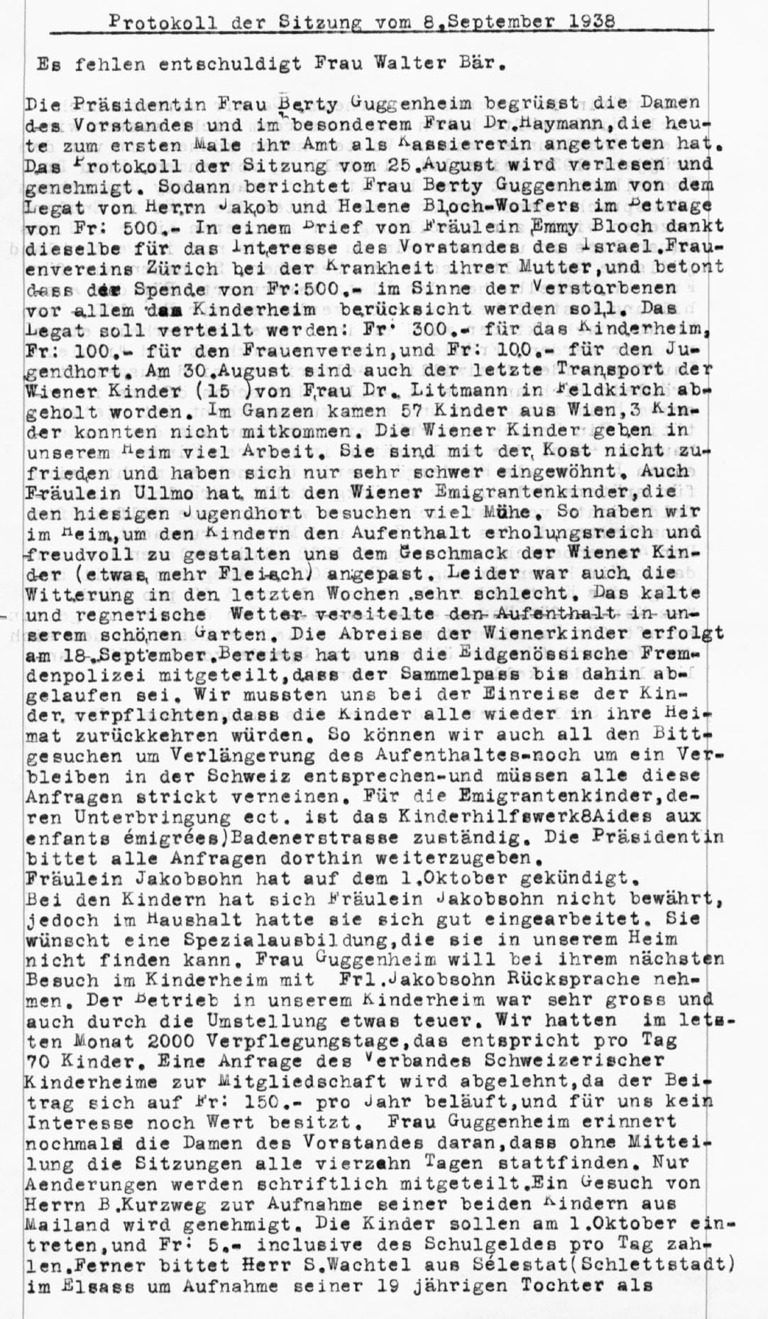 "Die Abreise der Wienerkinder erfolgt am 18.September. Bereits hat uns die eidgenössische Fremdenpolizei mitgeteilt, dass der Sammelpass bis dahin abgelaufen sei. Wir mussten uns bei der Einreise der Kinder verpflichten, dass die Kinder alle wieder in ihre Heimat zurückkehren würden. So können wir auch all den Bittgesuchen um Verlängerung des Aufenthalts – noch um ein Verbleiben in der Schweiz entsprechen – und müssen alle diese Anfragen strikt verneinen." (ETH Zürich, Archiv für Zeitgeschichte, Israelitischer Frauenverein Zürich, gegr. 1878, Archiv (1886-2003), IB IFZ-Archiv)