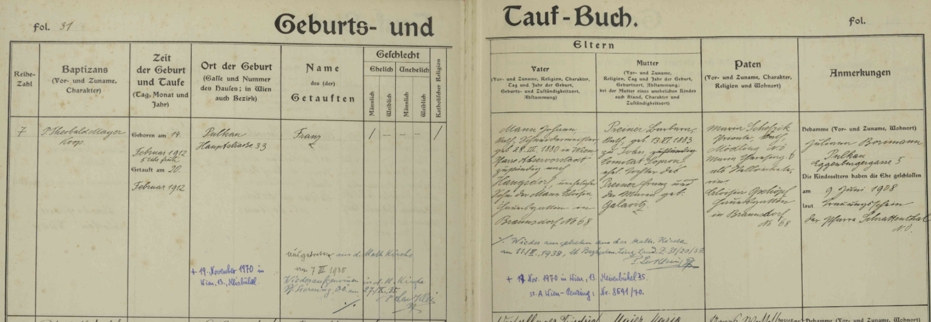 Mit religiösen Überzeugungen nahm er es nicht sehr genau. Katholisch geboren, trat er am 07.03.1935 in Wien aus der römisch katholischen Kirche aus, um am 27.10. desselben Jahres in Sierning bei Steyr wieder einzutreten. Er war zuvor aufgrund seiner illegalen NS-Aktivitäten in Oberösterreich untergetaucht.