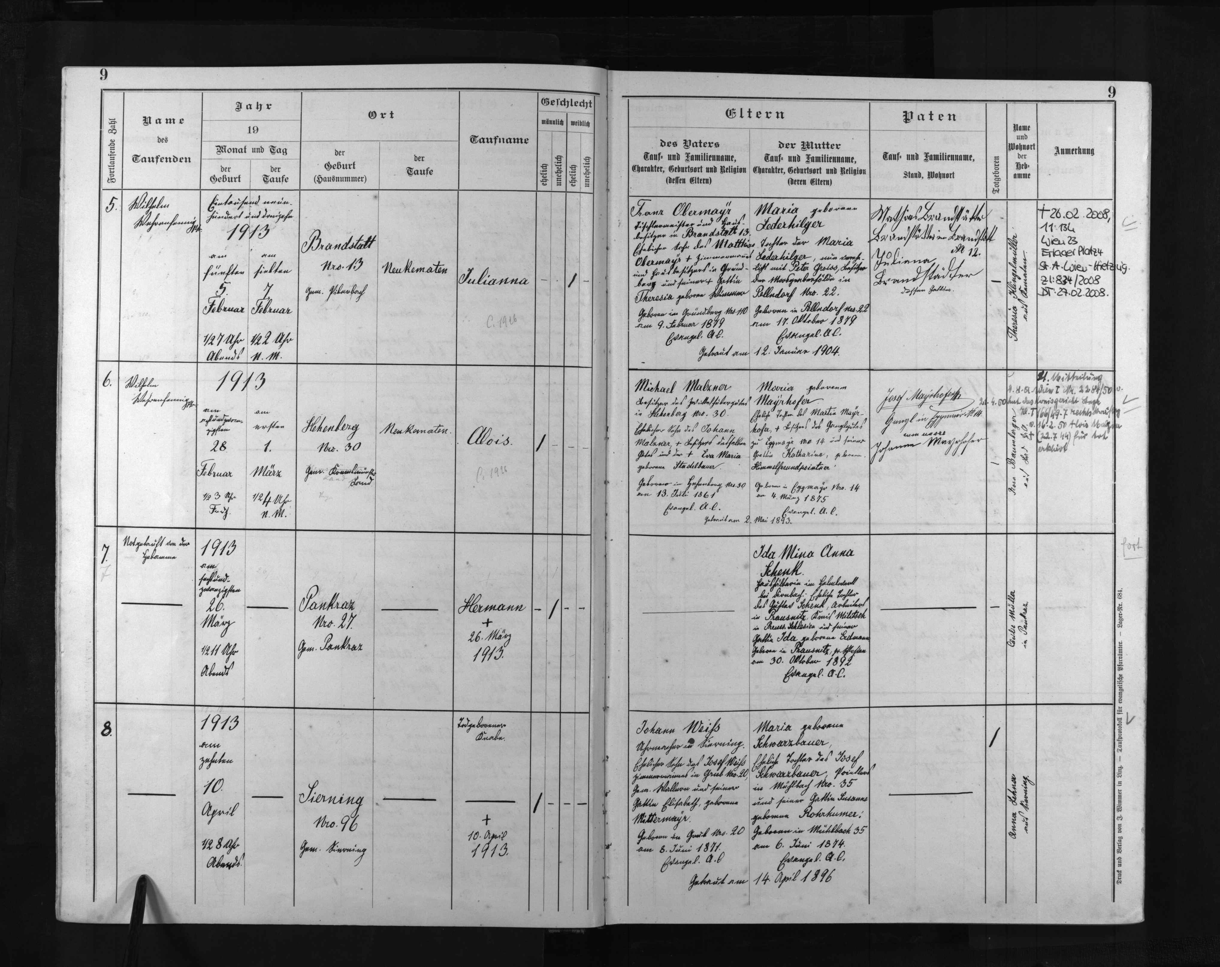 Nachdem Maria Obermayr nur drei Wochen nach dem Kauf des Hofes am 14.Juni 1911 eine Totgeburt eines Knaben, der Franz hätte heissen sollen, zu verkraften hatte, kam schließlich am 5.Februar 1913 als letztes Kind des Ehepaares Obermayr die kleine Julianna zur Welt. Getauft wurde sie nach zwei ihrer Tanten: zum einen nach der Schwester ihrer Mutter, Juliana Wöhrer, geborene Grois, die erst zwei Tage zuvor in Neukematen als Minderjährige geheiratet hatte, und zum anderen entweder nach der Schwester ihres Vaters, Anna, die allerdings bereits im Säuglingsalter 1888 gestorben war, oder einer Schwester der Mutter namens Anna, die ebenfalls als Säugling 1886 verstorben war.