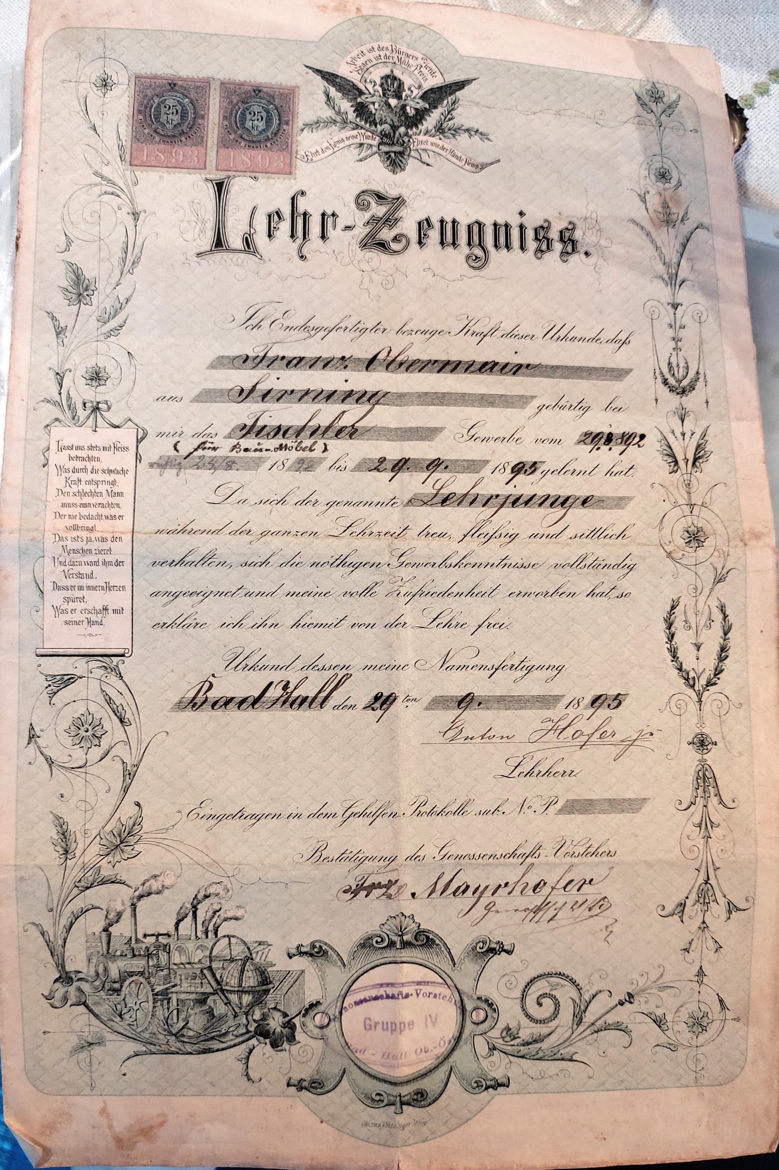 Nach der Tradition seines Vaters Mathias Obermayr (1836-1894), der Zimmermann war, ging Franz Obermayr beim Tischlermeister Anton Hofer junior in Bad Hall von 1892 bis 1895 in die Lehre zum Bau- und Möbeltischler. Die Lehre konnte er erfolgreich beenden, wie aus seinem Lehrzeugnis vom 29.09.1895 hervorgeht. Seinem Vater Mathias war es jedoch nicht vergönnt, den Lehrabschluss seines Sohnes Franz noch zu erleben, er starb während dessen Lehrzeit am 17.03.1894 an einem Schlaganfall (übrigens nur wenige Tage nach Anna Lederhilger, die am 11.03.1894 gestorben war und im Sterbebuch unmittelbar vor seinem Vater eingetragen ist und eine Cousine von Franz´ späterer Frau Maria war).